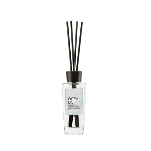 Il diffusore Ocealis combina un design sofisticato e moderno, ideale per ogni ambiente. La bottiglia in vetro trasparente esalta la purezza del contenuto, mentre il tappo nero opaco e le bacchette nere aggiungono un tocco di eleganza contemporanea.