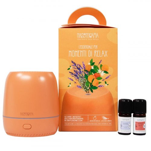 L'Essenziale per Momenti di Relax è un kit color albicocca che comprende il diffusore a ultrasuoni Petit Apricot e due oli essenziali biologici di Arancio Dolce e Lavanda ibrida.