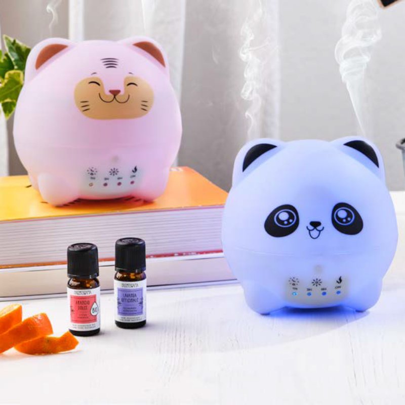 Adattabile a qualsiasi cameretta, Tigro & Panda è un simpatico diffusore dedicato ai più piccini che offre sul coperchio due differenti immagini di cuccioli. Il bambino potrà scegliere fra un tigrotto birichino o un dolcissimo panda per farsi accompagnare nelle sue attività quotidiane o nel riposo notturno. Dotato di timer integrato e di una delicata luce a led che cambia colore in modo graduale, può essere usato come diffusore, come lampada notturna o con entrambe le funzioni.