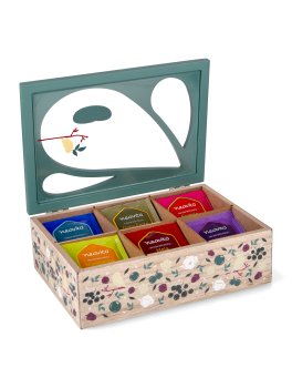 Il cofanetto regalo verde Tisalis in legno contiene 30 tisane profumate a base di frutti e fiori.