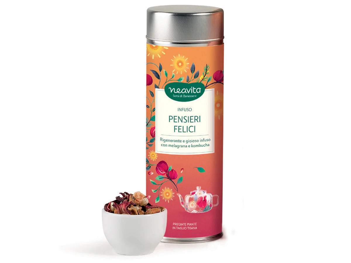 Ingredienti: mela, ibisco, melissa, rooibos, lemongrass, aromi, acido citrico, camomilla, petali di rosa, stevia, arilli di melagrana, aromi naturali di melagrana, estratto di tè Kombucha.