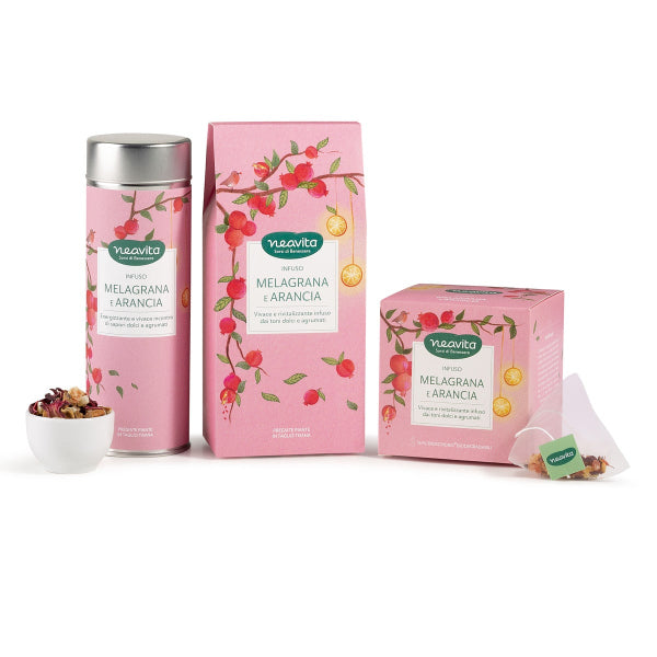 Pezzi di papaya, pezzi di mango, pezzi di mela, fiori di ibisco, pezzi di arancia, arilli di melograno, fiori di cartamo