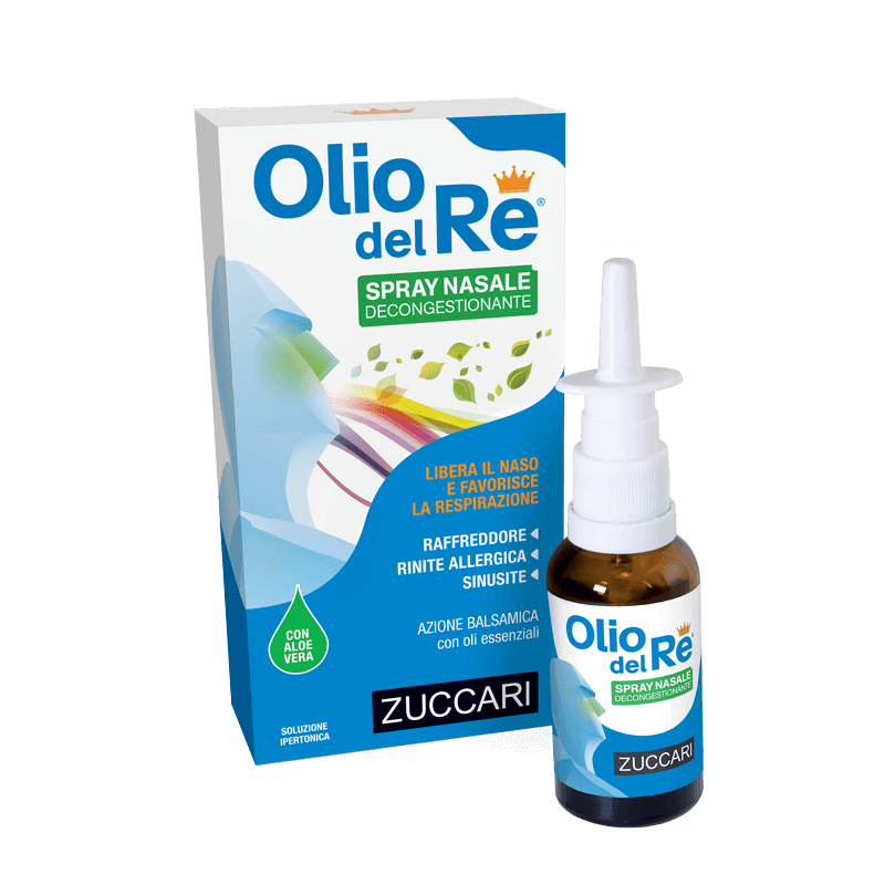 Olio del Re SPRAY NASALE DECONGESTIONANTE è un dispositivo medico costituito da una soluzione ipertonica a pH fisiologico arricchita con oli essenziali puri e gel d’Aloe vera. Olio del Re SPRAY NASALE DECONGESTIONANTE è indicato per liberare le fosse nasali, favorendo la respirazione grazie a un’azione combinata fra la soluzione ipertonica che promuove la fluidificazione del muco in eccesso, l’Aloe in grado di formare una sottile pellicola con azione idratanteprotettiva e gli oli essenziali che offrono un’immediata sensazione di sollievo balsamico.